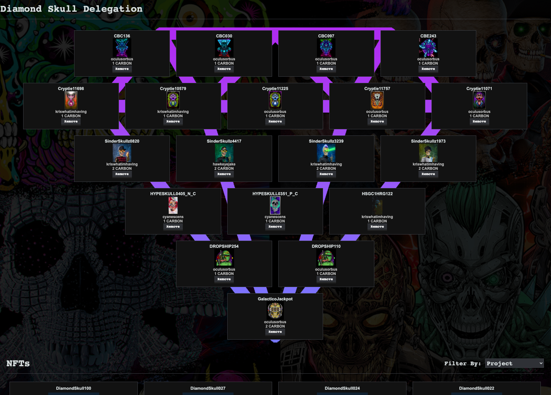 Diamond Skull owners control who can delegate to their Diamond Skull. They can choose to remove any delegated NFT they wish. Some Diamond Skull owners may want to kick delegators that place core project NFTs on their Diamond Skull that only yield 1 CARBON per night in hopes of filling the slot with a core project NFT that yields 2 CARBON. When a core project NFT is delegated to or removed from a Diamond Skull, the platform will generate a notification in the Skulliance discord server tagging the parties involved.