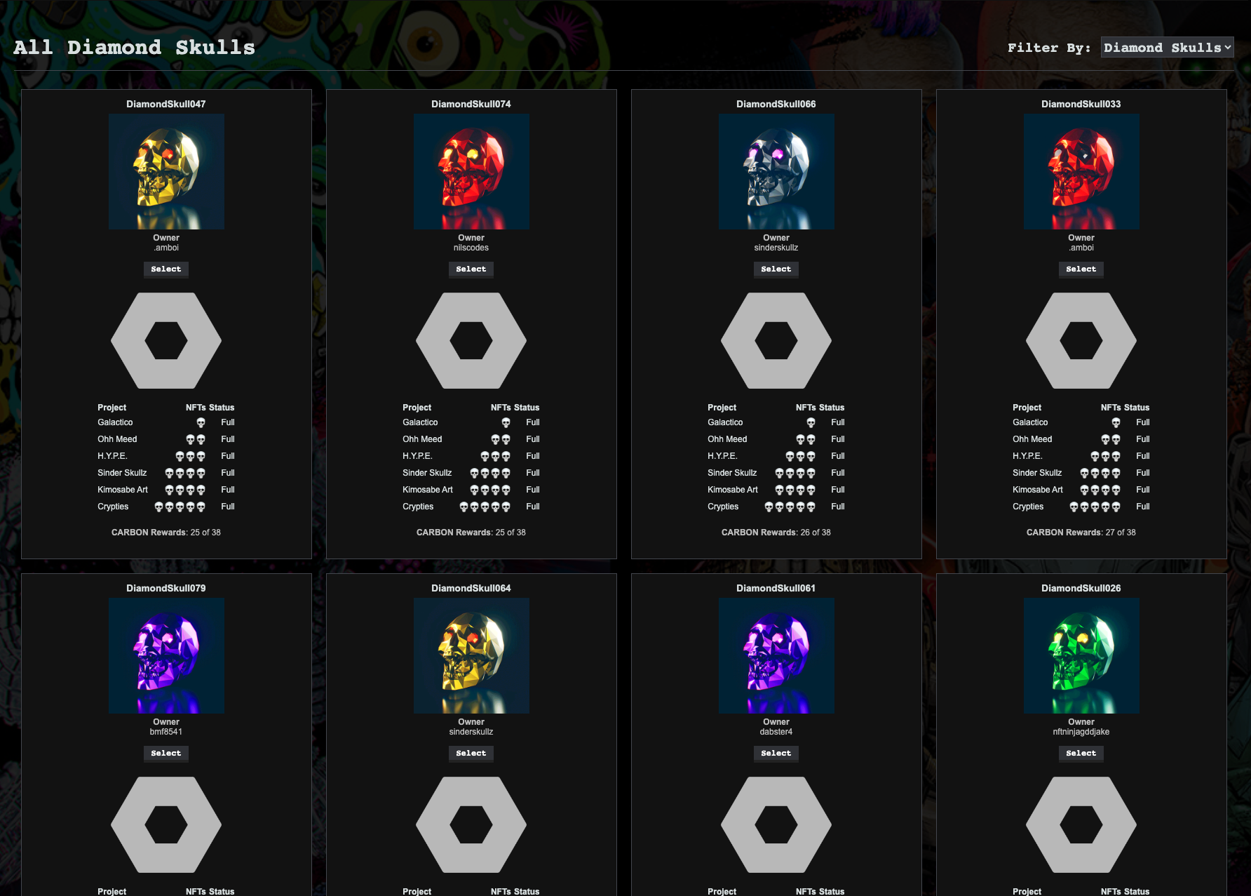 Diamond Skull delegations yield CARBON, off-chain points that can be burned in multiples of 100 for a single DIAMOND. CARBON is rewarded nightly for each core project NFT that is delegated to a Diamond Skull and the amount matches the reward rate of the corresponding project. Between 1-2 CARBON can be acquired nightly depending on each core project NFT delegated. CARBON rewards are a permanent addition to staking.