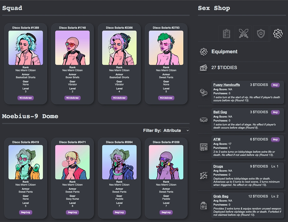 Send OG Disco Solaris NFTs in squads of up to 4 into Oculus Lounge and browse consumables that can be purchased to improve probabilities of getting higher scores. A squad with all clothing, toys, and item types is considered a VIP Squad and has the best probability within the game.