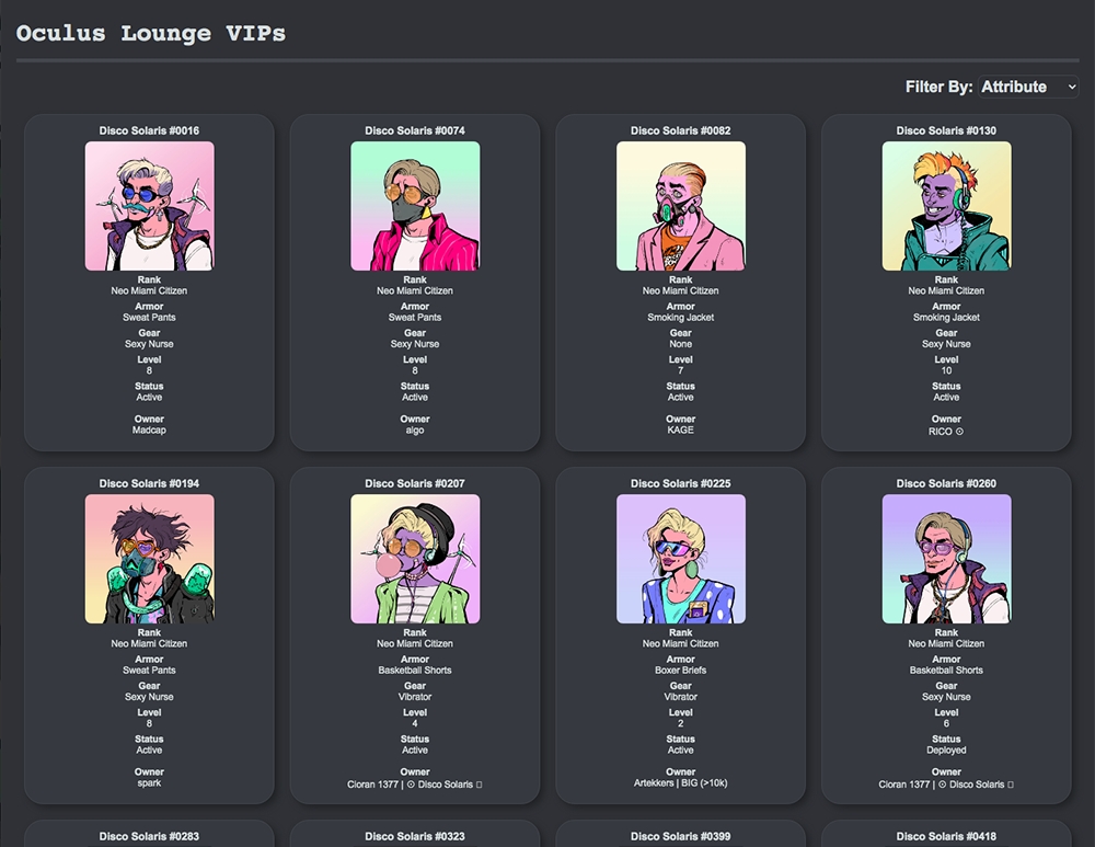 The Oculus Lounge game allows VIP token holders to send their OG Disco Solaris NFTs to the club with a combination of clothing, toys, and items.