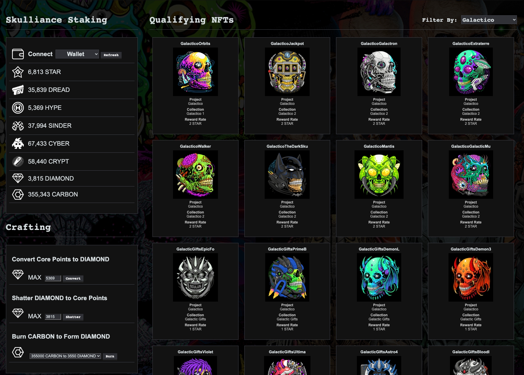 The Skulliance staking platform allows holders of qualifying core and partner NFTs the ability to accrue off-chain points that can be redeemed in the staking store for exclusive incentives.