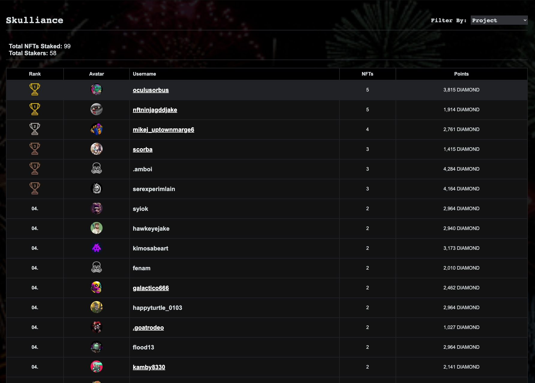 Skulliance provides an overall leaderboard as well as individual leaderboards for founding artists and partner projects. There is also an all time high leaderboard for missions as well as a monthly leaderboard for missions.