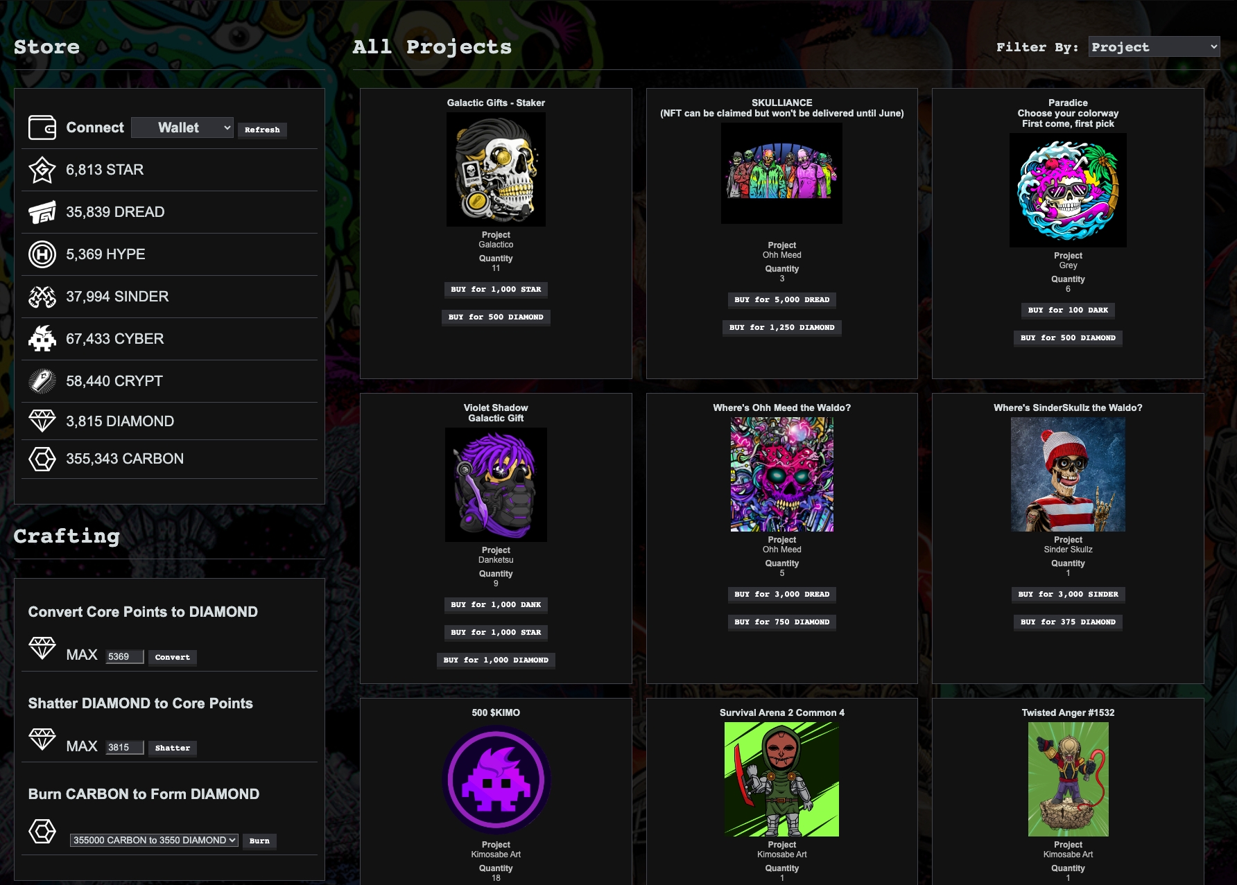 DIAMOND is the premier point within the Skulliance ecosystem and can be utilized to claim any incentive from the staking store, either at a discount for core artist offerings or a premium for partner offerings.